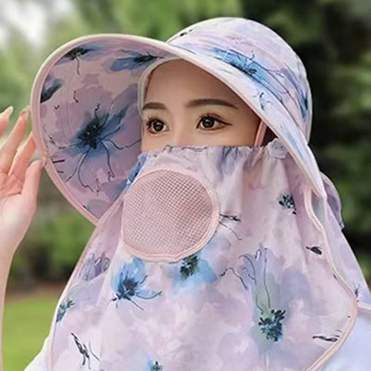 Rose Print Large Brim Shawl Mask Sun Hat