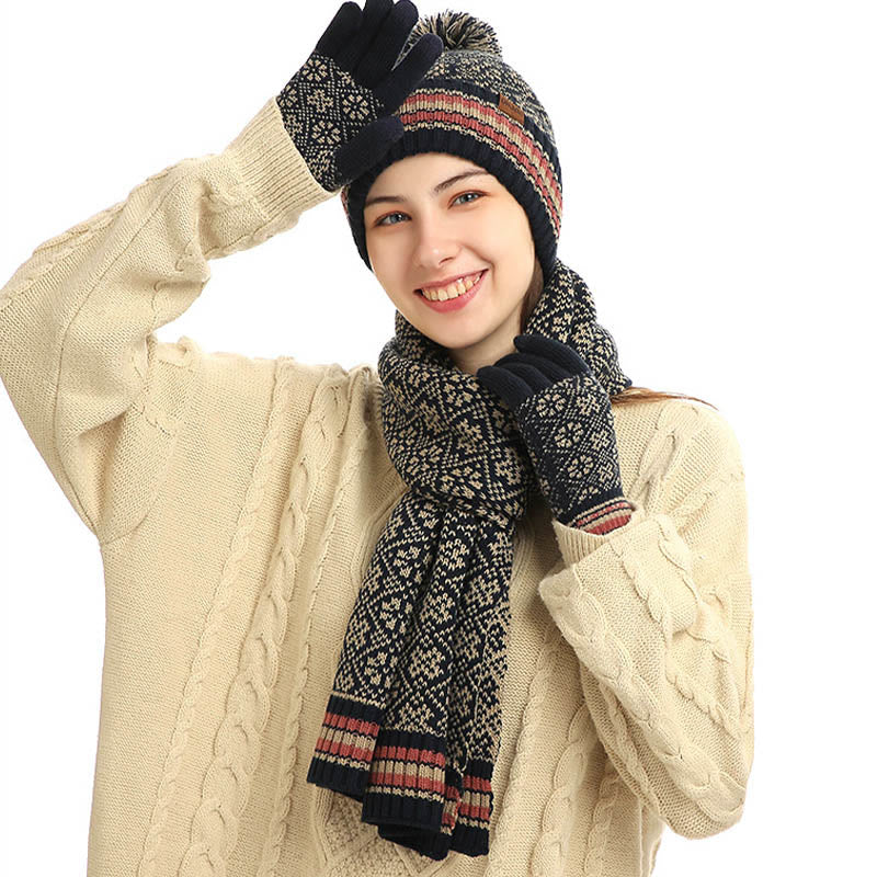 The package Includes: 1 piece of scarf, 1 beanie, 1 pair of gloves